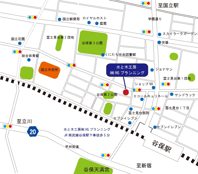 中央高速道路国立府中ICを下車し、甲州街道、国立インター入り口交差点を左折、そのまま直進し、谷保天満宮前を右折、南武線を通過するとT地路になります。それを左折し一つ目の信号のすぐ先の左側が当社となります。(約6分)